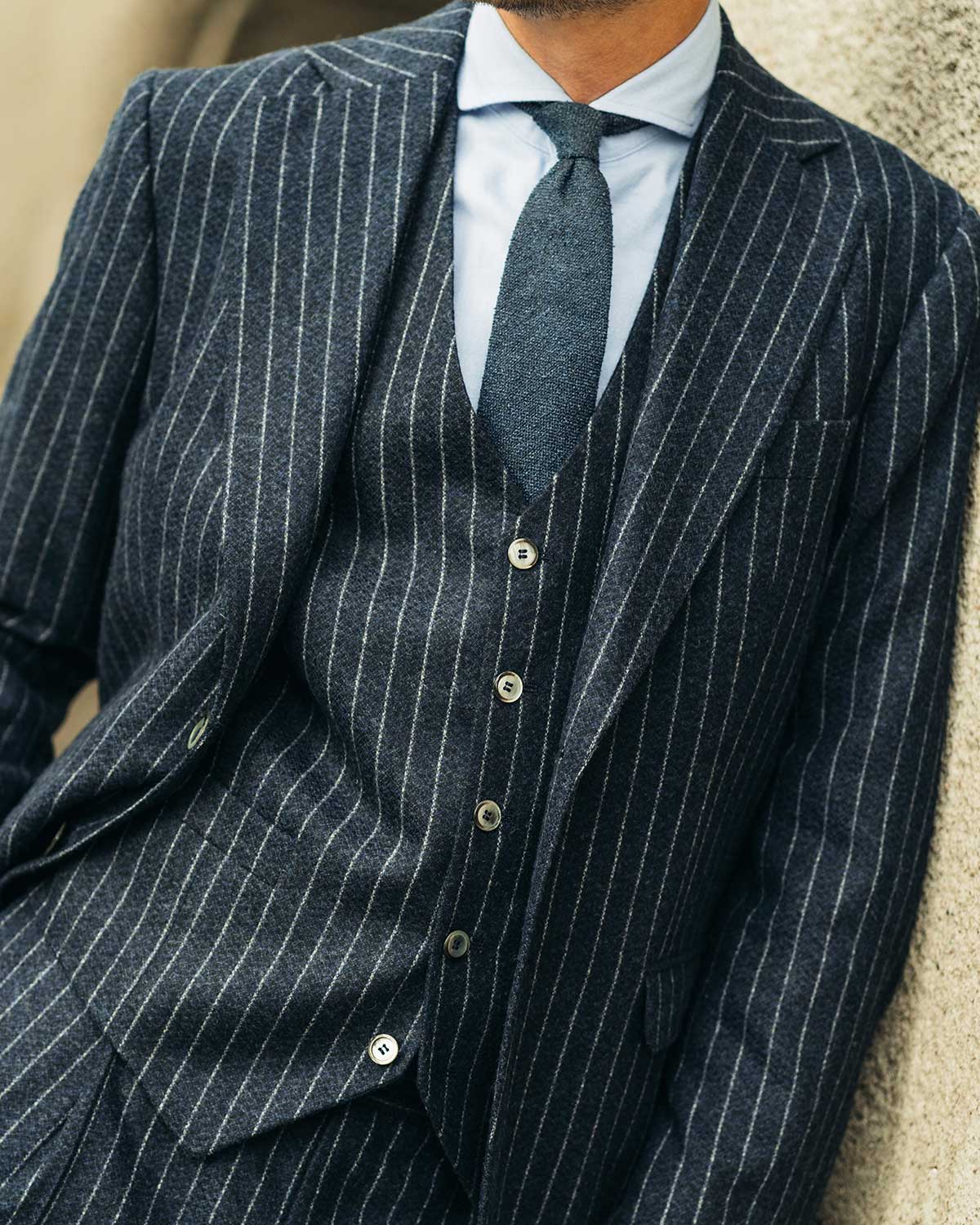 - Eliot blue chalk stripe flannel suit from SIR of Sweden.