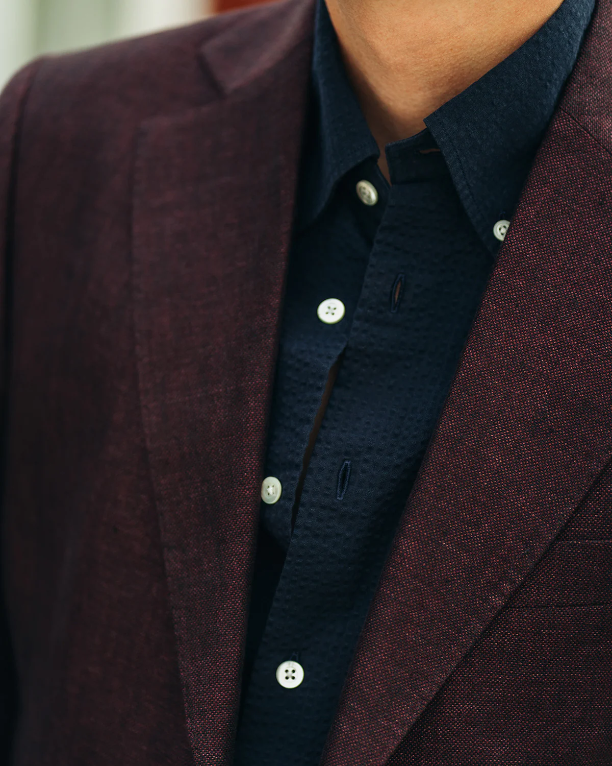 - Burgundy linen jacket from SIR of Sweden.
